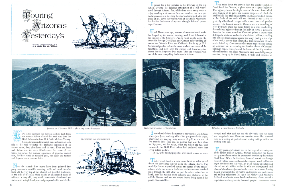 Until fifteen years ago, streams of transcontinental traffic had looped up the narrow, twisting road I had followed to the summit of the Sitgreaves Pass to wind slowly down the other side through Gold Road and Oatman before striking off toward the Colorado River and California. But in 1952 U.S. 66 was realigned to follow the easier lowland route around the mountains, and now only the curious and knowledgeable choose the old Sitgreaves Pass route. They are rewarded with one of the most compelling landscapes in Arizona.