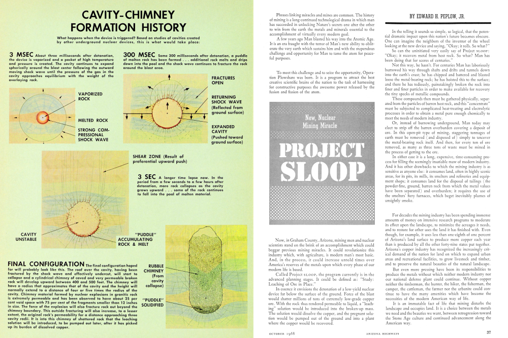 All of which sounds and is exciting. It is a brand-new concept of mining in the years to come. But, unfortunately, it must be qualified. First, none of the copper produced by Project SLOOP will go onto the commercial market. There are a myriad of complex studies which must be made on it. What effect, if any, will the nuclear blast have on the physical and chemical characteristics of the metal? Nuclear science still is too little advanced to say. Perhaps there will be none; perhaps there will be significant and interesting changes.