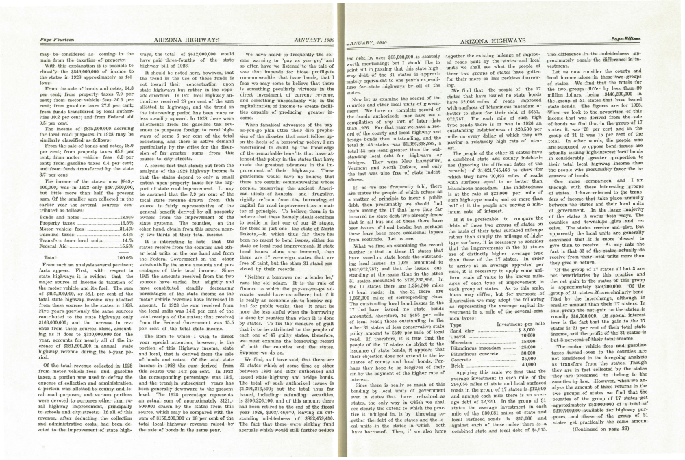 When fanatical advocates of the pay-as-you-go plan utter their dire prophecies of the disaster that must follow upon the heels of a borrowing policy, I am constrained to doubt by the knowledge of the remarkable benefits that have attended that policy in the states that have made the greatest advances in the improvement of their highways. These gentlemen would have us believe that there are certain commonwealths whose people, preserving the ancient American ideals of honesty and frugality, rigidly refrain from the borrowing of capital for road improvement as a matter of principle. To believe them is to believe that these homely ideals continue to reside in just one of our 48 states, for there is just one the state of North Dakota, in which thus far there has been no resort to bond issues, either for state or local road improvement. If state bond issues alone are immoral, then there are 17 sovereign states that are free of taint, but the other 31 stand convicted by their records.