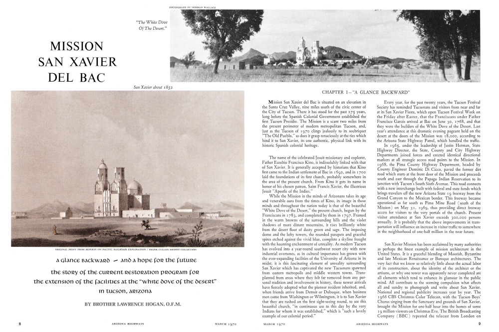 The Mission and the writer personally are most grateful to ARIZONA HIGHWAYS for this beautiful and painstaking presentation of The White Dove of the Desert, its past, its present and its hoped for future. Would it be a presumption on my part to suggest to its readers that small gifts from many sources could accomplish quickly what drives and campaigns would need much time and labor to achieve? Checks for the completion of the restoration program can be made to SAN XAVIER RESTORATION, and mailed to Route 11, Box 645, Tucson, Arizona 85706.