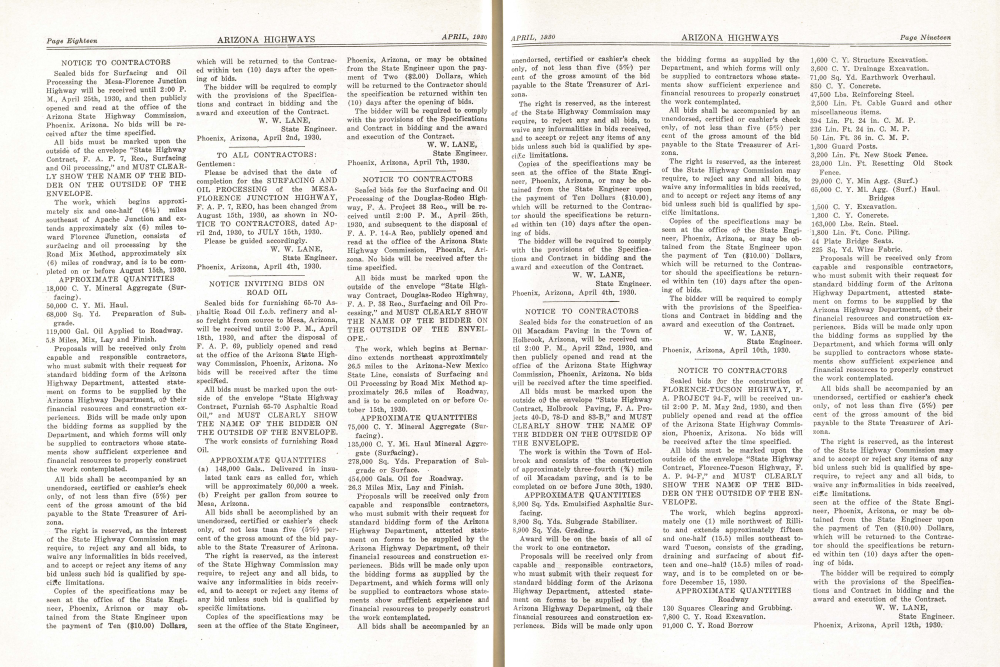 Sealed bids for Surfacing and Oil Processing the Mesa-Florence Junction Highway will be received until 2:00 P. M., April 25th, 1930, and then publicly opened and read at the office of the Arizona State Highway Commission, Phoenix. Arizona. No bids will be received after the time specified.
