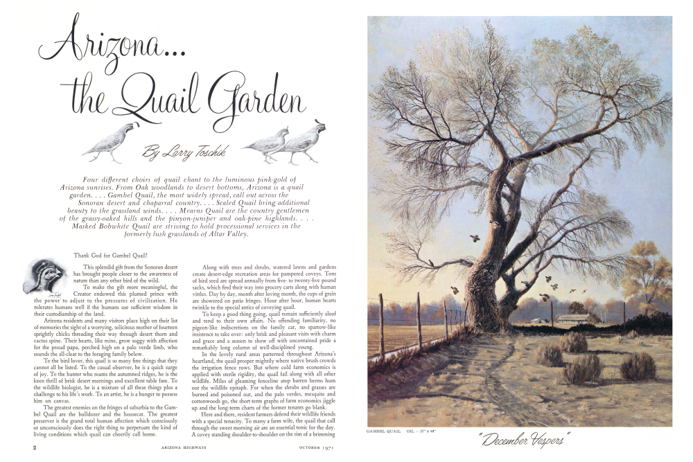The painting, "December Vespers," is a tribute to one of the priceless moments of contact with life's basics those threads of grace that bind the working day life with the fabric of reason for living. The lowering December sun is caught in the filagree of cottonwood limbs. The dimming light of day brings on the supper-light glow in farmhouse kitchens. A quail calls from his lookout station to gather the covey to the water's edge. From harvested grain fields, the gleaners whir off to ditch bank gossip and perhaps a last-of-the-day dusting in the soft, soft earth along the gophered berms. This is a time of clean, pungent desert scents mingling with the first whisps from mesquite glow-ing in home hearths to fend off the night's growing chill.