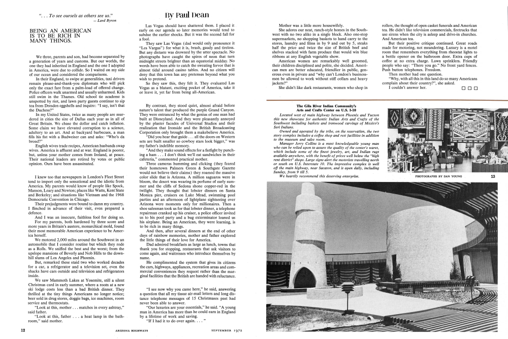 Three cameras humming and clicking (they feared their hometown Palmers Green & Southgate Gazette would not believe their claims) they roamed the massive color slide that is Arizona. A million saguaros were in bloom, the desert was wearing its perfume of early summer and the cliffs of Sedona shone copper-red in the twilight. They thought that lobster dinners on Santa Monica pier, cruisers on Lake Mead, swimming pool parties and an afternoon of lightplane sightseeing over Arizona were moments only for millionaires. Then a shoe salesman took us for that lobster dinner, a telephone repairman cranked up his cruiser, a police officer invited us to his pool party and a bug exterminator loaned us his airplane. Being an American, they were learning, is to be rich in many things. And then, after several dinners at the end of other days of rainbow memories, mother and father explored the little things of their love for America.
