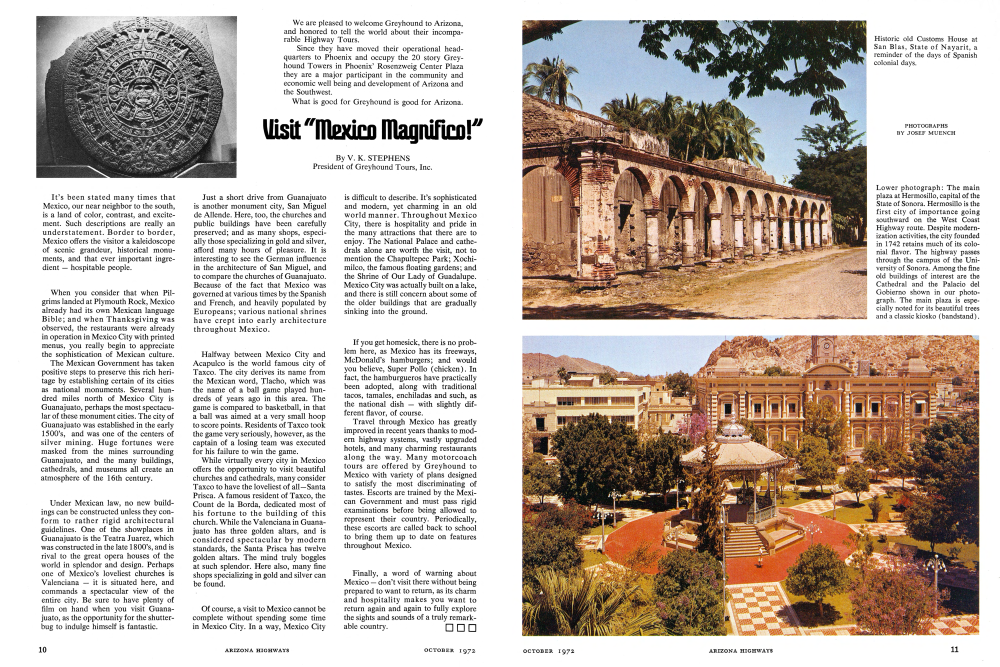 It's been stated many times that Mexico, our near neighbor to the south, is a land of color, contrast, and excitement. Such descriptions are really an understatement. Border to border, Mexico offers the visitor a kaleidoscope of scenic grandeur, historical monuments, and that ever important ingredient hospitable people.