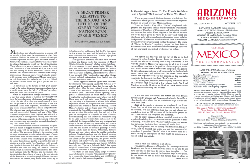 Mexico is an ever changing country, a country with an impulse perhaps more vigorous than most other Latin American Nations, its industrial, commercial and agricultural expansion has set a pace for other nations to follow, yet it still has a long road to travel and many goals to achieve that seem to be still very far off in attaining. There is however, a sense of awareness among the people and Government of this nation of Mexico's new strength and role among the Latin American Countries, but at the same time this awareness also embraces our Country's shortcomings which are many. To understand a country well, one must know its history and Mexico has a history as varied and rugged as its landscape. It is very difficult to portray a whole nation and give a precise idea in a few lines.A parallelism in the history of that great country which is the United States and ours may perhaps give us a partial answer as to the "whys" of Mexico's seemingly slow pace in its structural development. When the pilgrims from Europe first arrived to what is now the United States of America they brought with them the hope of escaping religious and ideological persecution; the idea of freedom was deeply rooted in them and the promise of a new life loomed high in this new continent. There were carpenters, blacksmiths, masons and people of many other varied trades and professions. The pilgrims' idea was to strengthen their own communities and preserve their freedom and way of life. When complete independence from England was achieved in the latter part of the eighteenth century, there followed a period of lasting prosperity, the flourishing of the arts and commerce and an expansion unequalled perhaps by any other nation in the world.