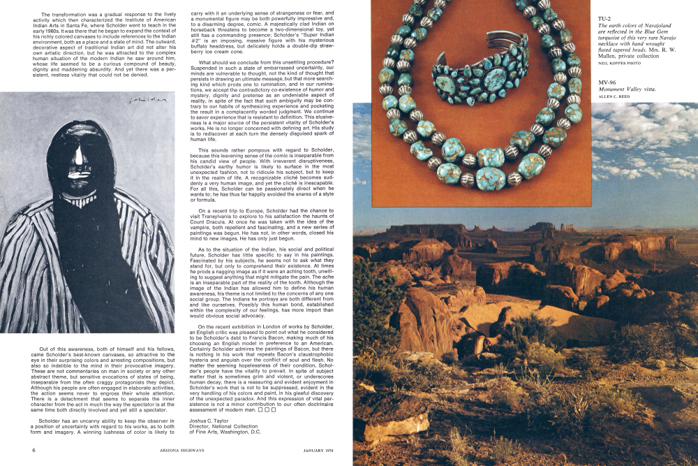 Editor's Note: The Indian portrait, left, and others accompanying this article are from a collection of 17 untitled original oils distinguished as "The Dartmouth Portraits," done by Fritz Scholder during his tenure as artist-in-residence at Dartmouth University, Hanover, New Hampshire, during the fall of 1973. The series will be in exhibition at the Cordier-Ekstrom, Inc., gallery, 980 Madison Avenue, New York, from January 8, through February 9. The Dartmouth Portraits indicate a feeling of respect for the strong and positive qualities of the Indian character, which we feel reflects the thinking of an artist whose works speak most eloquently of new found peace, understanding and security. After spending an afternoon with Fritz Scholder at his studio, on Cattle Track Road, Scottsdale, and listening to his plans for the future, we must agree with our friend James Bialac, one of the Southwest's most qualified collectors and appraisers of Indian art, who remarked, "Fritz Scholder will be another Picasso."
