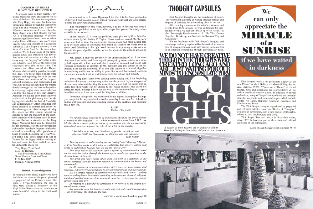As we go to press we learn that the Tony Begay Memorial show and auction fell far short of the ideal. We were not acquainted with Tony Begay, the man. We knew him through his art and through his friends who loved him and respected him. It made no difference to members of other tribes that Tony Begay was a full blooded Navajo. Art is a universal language to civilized humans regardless of race, creed or ethnic and political difference. We don't know exactly who first thought of a collective tribute to Tony Begay's memory in the form of a trust fund for his three minor children. We do know many of the distin-guished artists and craftsmen who gave of their souls and resources and they are, in every way, the "royalty" of Indian artists and artisans. Each gave of the best of his resources available at the time. The trustees and directors of the Heard Museum did everything possible to attain the ideal. The local press notices were frequent and appealing, but as is the case with shows and auctions of this import, national awareness and participation are vital. Our publication schedule pre-empted timely coverage and the best we hoped for is not enough to give three minor fatherless children the break in life they deserve. Although we did not know their father we are hooked on his philosophy that "work-ing together kindles the fires of friendship and understanding." After consulting with those qualified to counsel and advise on the advantages and disadvantages of using this space for this special appeal we decided to test the measure of the chari-table qualities of the human race. In truth no contribution or donation to the Tony Begay Memorial fund can be deductible for tax purposes. Here the only reward for a charitable impulse is the pure satisfaction related to something called goodness of heart. From the beginning the Great West-ern Bank and Trust offered to act as Trustee for the Begay children waiving all fees and costs. We have mailed our non-tax-deductible check to: