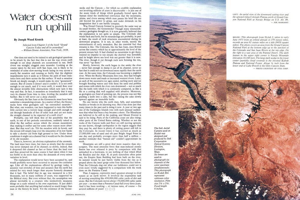 Was Grand Canyon formed in precisely the same way as its small brother, the Goosenecks? Though many nineteenthcentury geologists thought so, it is now generally believed that the explanation is not quite so simple. The Colorado also winds back and forth, but its meanderings are probably, in part at least, the result of rock structures encountered during its downward progress. It is not, in other words, merely the entrenchment of early meanders. But the essential fact that remains is this: The Colorado, like the San Juan, once flowed across flat country which lay at approximately the level of the present stream bed. It had climbed no mountains to get there; resisted no impulse to run steeply the shortest way downhill; and its height above sea level was not greater than it is now. The river, though it cut through rock now forming the rim, was never "up there."