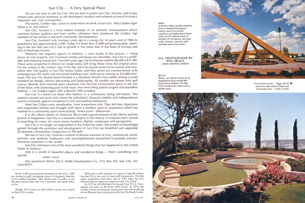 We see in Sun City, Arizona a festival of diverse interests of civic, commercial, social, patriotic and aesthetic endeavors and accomplishments unmatched in promise and performance anywhere in the world.