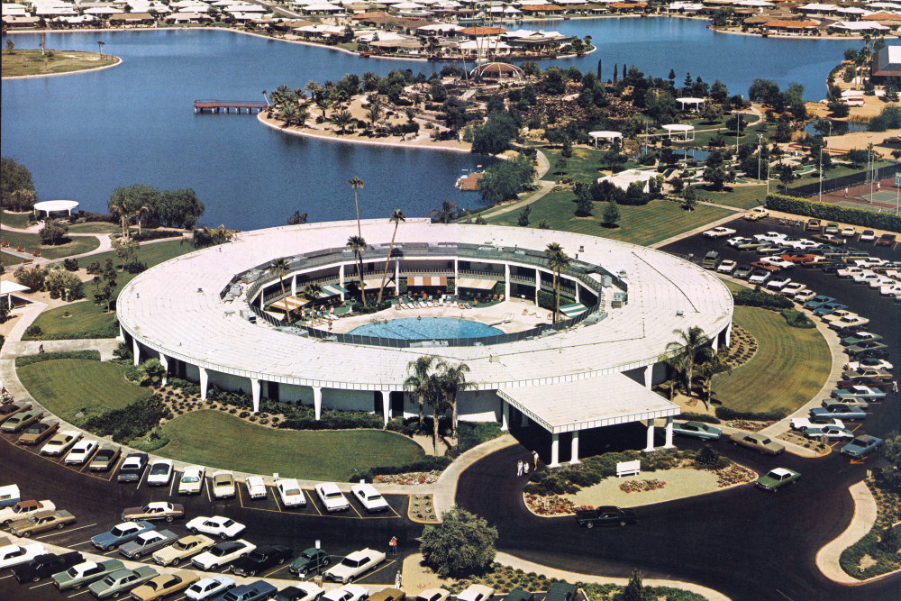 RIGHT: Arizona's tallest sundial stands in front of Sundial Recreation Center, one of five lavish complexes providing Sun Citians with over $7 million worth of facilities for recreation, arts and crafts, lectures, concerts, club meetings and social events.
