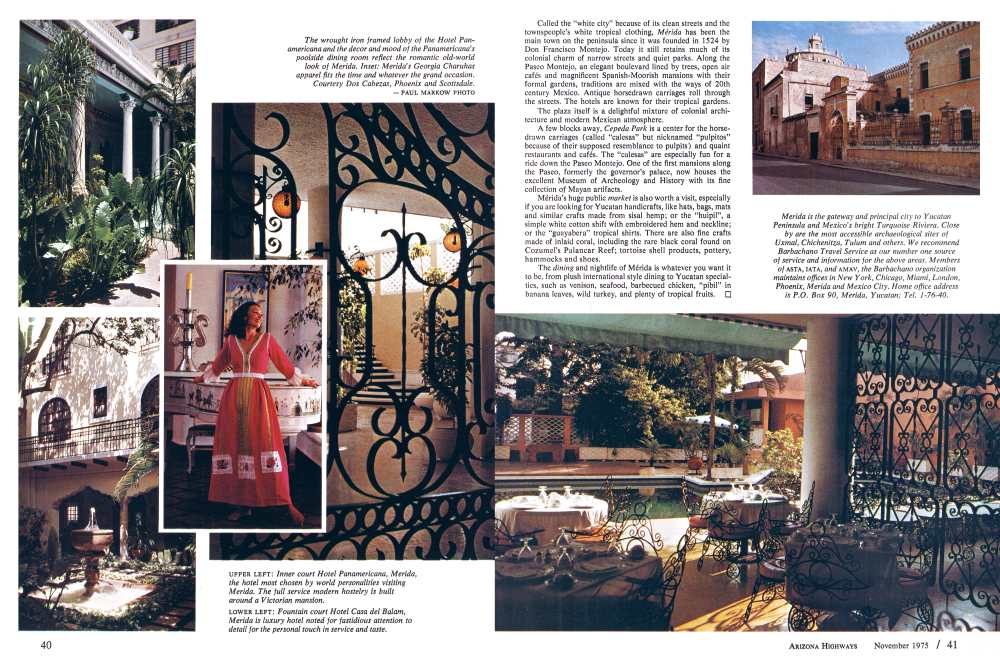 The wrought iron framed lobby of the Hotel Panamericana and the decor and mood of the Panamericana's poolside dining room reflect the romantic old-world look of Merida. Inset: Merida's Georgia Charuhas apparel fits the time and whatever the grand occasion. Courtesy Dos Cabezas, Phoenix and Scottsdale. - PAUL MARKOW PHOTO UPPER LEFT: Inner court Hotel Panamericana, Merida, the hotel most chosen by world personalities visiting Merida. The full service modern hostelry is built around a Victorian mansion.