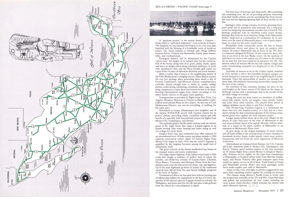 The ridge-runner highway of the Jalisco coast leads to little roads that dangle a necklace of perfect bays to entice the traveler, out-of-the-way retreats of Cuastecomate, Chamela, Playa Blanca, Tenacatita, and Melaque. Down from the Guadalajara area come the discoverers by plane, rail, and highway. Up to the near highlands go those in search of the traditional carnival time Mardi Gras fun and famed bullfight programs of the town of Autlan..