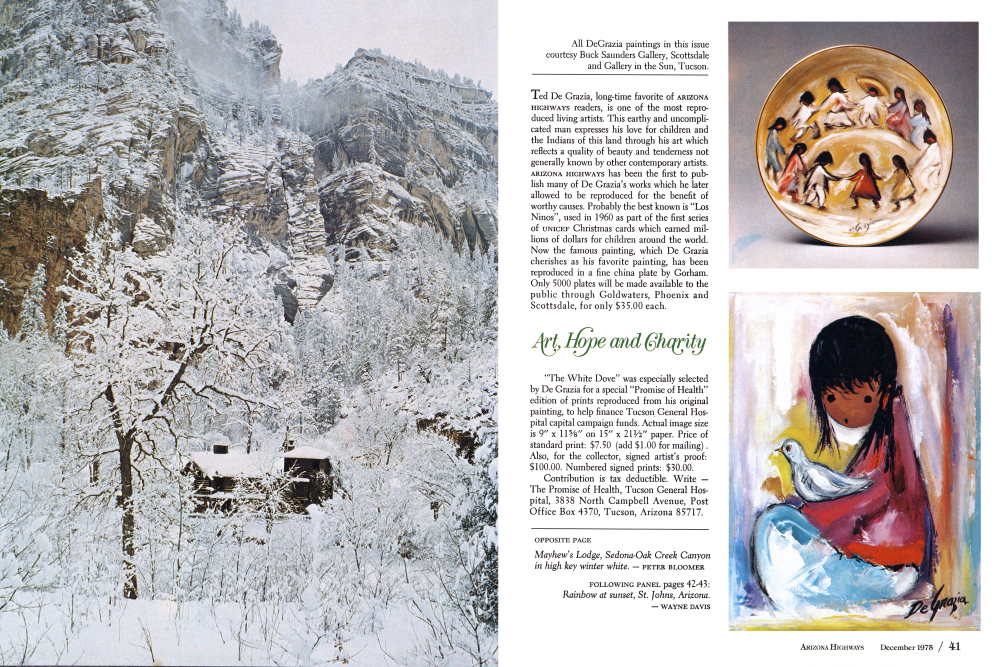 Ted De Grazia, long-time favorite of ARIZONA HIGHWAYS readers, is one of the most reproduced living artists. This earthy and uncomplicated man expresses his love for children and the Indians of this land through his art which reflects a quality of beauty and tenderness not generally known by other contemporary artists. ARIZONA HIGHWAYS has been the first to publish many of De Grazia's works which he later allowed to be reproduced for the benefit of worthy causes. Probably the best known is “Los Ninos”, used in 1960 as part of the first series Of UNICEF Christmas cards which earned millions of dollars for children around the world. Now the famous painting, which De Grazia cherishes as his favorite painting, has been reproduced in a fine china plate by Gorham. Only 5000 plates will be made available to the public through Goldwaters, Phoenix and Scottsdale, for only $35.00 each.