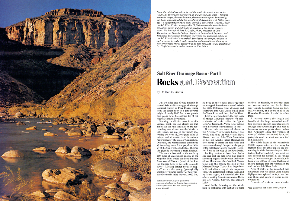 From the original crustal surface of the earth, the area known as the Verde-Salt River basin has moved up and down many times forming mountain ranges, then sea bottoms, then mountains again. Structurally, this basin was outlined during the Mazatzal Revolution 11/2 billion years ago a significant geological event in what is now central Arizona. Today, the Salt River Project manages this 13,000-square-mile watershed and conserves, stores, and distributes its invaluable life-giving resource water. We have asked Bert E. Griffin, Ph.D., Professor of Civil Technology at Phoenix College, Registered Professional Engineer, and Registered Professional Geologist, to prepare this geological outline of the Salt River Project's watershed. Simplifying this complex subject in such a way as to make it understandable and interesting to those of us who are not students of geology was no easy task, and we are grateful for Dr. Griffin's expertise and assistance. The Editor by Dr. Bert E. Griffin