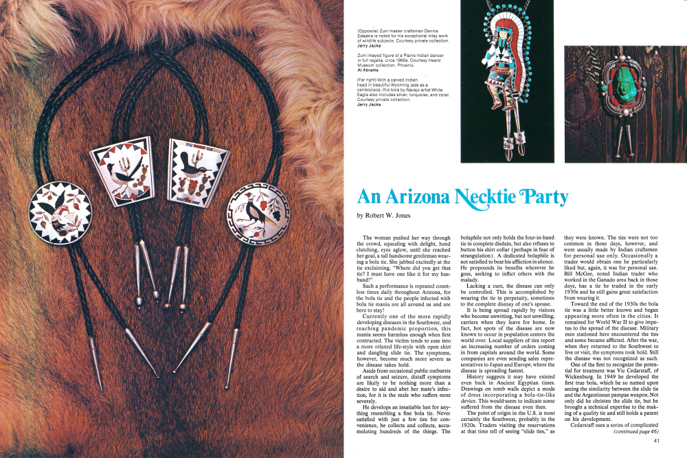 Such a performance is repeated countless times daily throughout Arizona, for the bola tie and the people infected with bola tie mania are all around us and are here to stay!