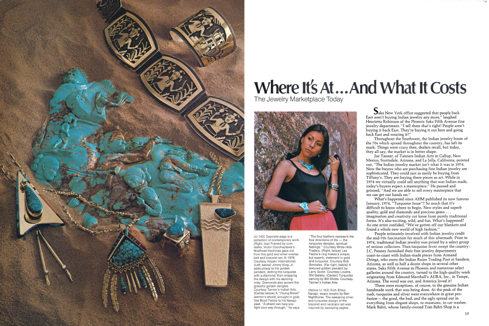 What's happened since AHM published its now famous January, 1974, "Turquoise Issue"? So much that it's difficult to know where to begin. New styles and superb quality, gold and diamonds and precious gems imagination and creativity cut loose from purely traditional forms. It's also exciting, wild, and fun. What's happened? As one artist confided, "We've gotten off our blankets and found a whole new world of high fashion."
