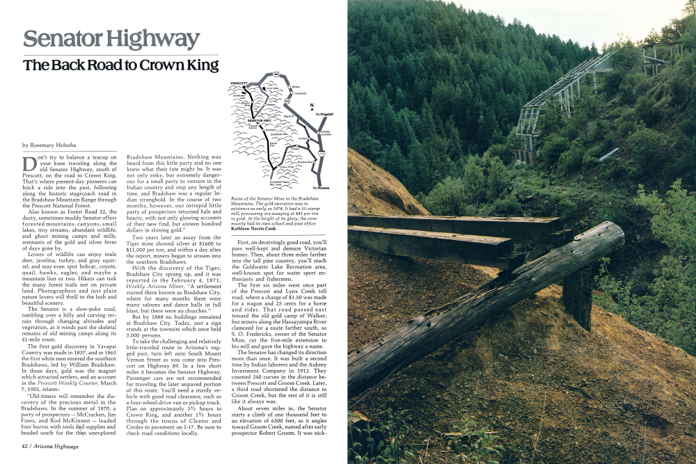 To take the challenging and relatively little-traveled route to Arizona's rugged past, turn left onto South Mount Vernon Street as you come into Prescott on Highway 89. In a few short miles it becomes the Senator Highway. Passenger cars are not recommended for traveling the later unpaved portion of this route. You'll need a sturdy vehicle with good road clearance, such as a four-wheel-drive van or pickup truck. Plan on approximately 31/2 hours to Crown King, and another 11/2 hours through the towns of Cleator and Cordes to pavement on I-17. Be sure to check road conditions locally.