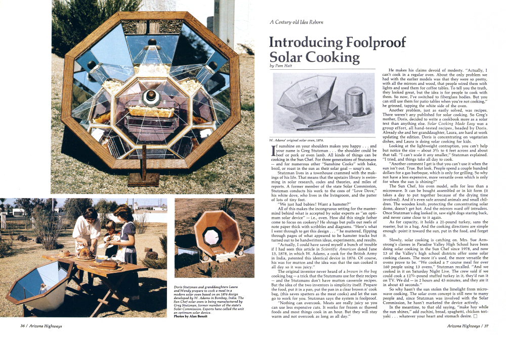 Slowly, solar cooking is catching on. Mrs. Sue Armstrong's classes in Paradise Valley High School have been doing solar cooking in the Sun Chef since 1978, and now 13 of the Valley's high school districts offer some solar cooking classes. The more it's used, the more versatile the ovens prove to be. “We cooked a 7 course meal for over 160 people using 13 ovens,” Stutzman recalled. “And we cooked in it on Saturday Night Live. The crew said if we could cook a 121/2-pound stuffed turkey in it, they'd run it on TV. We did — in 2 hours and 45 minutes, and they ate it in about 45 seconds.” So why hasn't the sun stolen the limelight from microwave cooking. The solar oven concept is still new to many people and, since Stutzman was involved with the Solar Commission, he hasn't marketed the device actively.