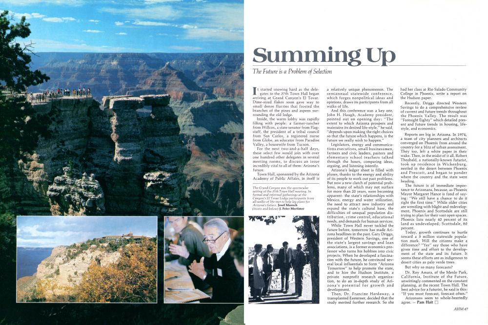 While Town Hall never tackled the future before, tomorrow has made Arizona headlines in the past. Gary Driggs, president of Western Savings, one of the state's largest savings and loan associations, is a former economics professor who turns his hobbies into civic projects. When he developed a fascination with the future, he convinced several local influentials to form “Arizona Tomorrow” to help promote the state, and to hire the Hudson Institute, a private nonprofit research organization, to do an in-depth study of Arizona's potential for growth and development.