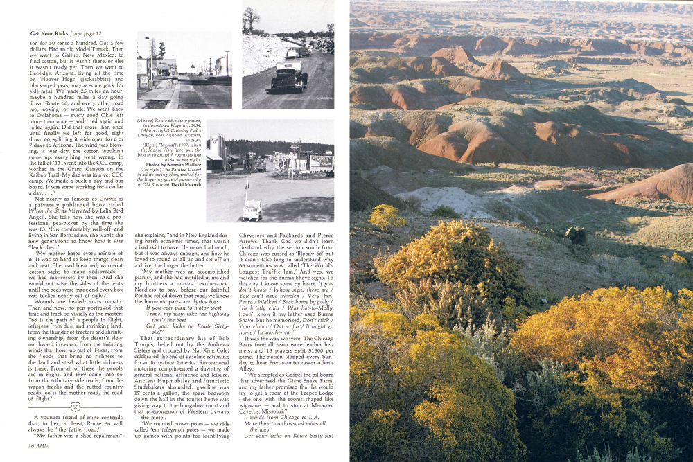 "My mother was an accomplished pianist, and she had instilled in me and my brothers a musical exuberance. Needless to say, before our faithful Pontiac rolled down that road, we knew the harmonic parts and lyrics for: If you ever plan to motor west Travel my way, take the highway that's the best Get your kicks on Route Sixtysix!"