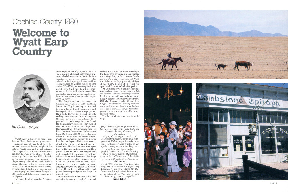 The Brothers Earp brought gunslinging to a fine art, in this land where the horizon literally seems to roll on forever. And, in the process, they gathered to themselves the status of folk heroes.James, Virgil, Wyatt, Morgan, and Warren are gone now, lo these many years, but throughout Cochise County the places where their deeds were done remain, mostly untouched except by the heavy hand of time, left to dream in the warm Arizona sun.