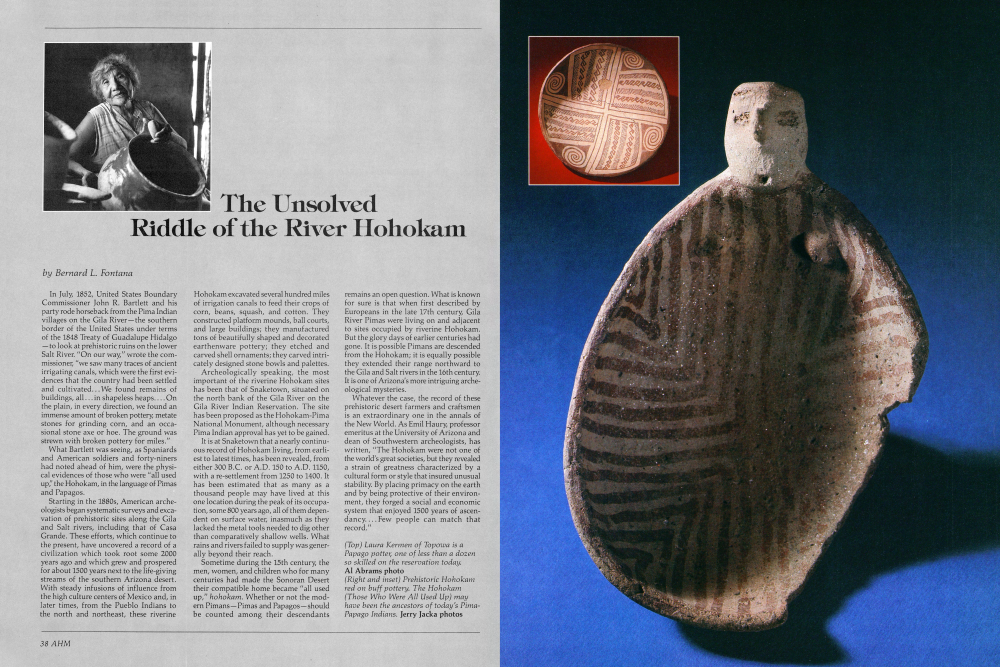 Sometime during the 15th century, the men, women, and children who for many centuries had made the Sonoran Desert their compatible home became “all used up,” hohokam. Whether or not the modern Pimans-Pimas and Papagos-should be counted among their descendants remains an open question. What is known for sure is that when first described by Europeans in the late 17th century, Gila River Pimas were living on and adjacent to sites occupied by riverine Hohokam. But the glory days of earlier centuries had gone. It is possible Pimans are descended from the Hohokam; it is equally possible they extended their range northward to the Gila and Salt rivers in the 16th century. It is one of Arizona's more intriguing archeological mysteries.