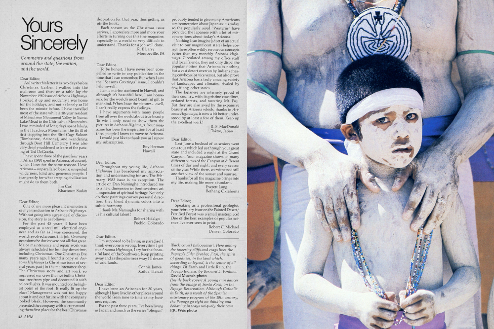 Dear Editor, As I write this letter it is two days before Christmas. Earlier, I walked into the mailroom and there on a table lay the November 1982 issue of Arizona Highways. I picked it up and suddenly I was home for the holidays, and not as lonely as I'd been the minute before. I have travelled most of the state while a 10-year resident of Mesa; from Monument Valley to Yuma, Lake Mead to the Chiricahua Mountains. I was reminded of long days spent hiking in the Huachuca Mountains, the thrill of first stepping into the Bird Cage Saloon (Tombstone, Arizona), and wandering through Boot Hill Cemetery. I was also very deeply saddened to learn of the pass-ing of Ted DeGrazia.