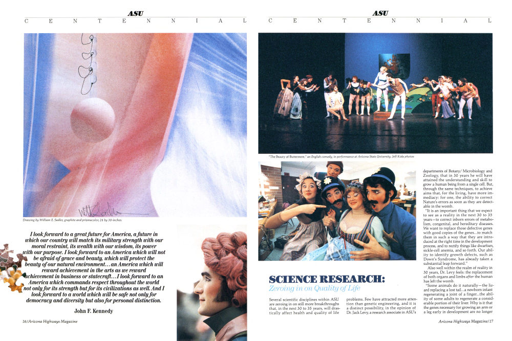 John F. Kennedy Several scientific disciplines within ASU are zeroing in on still more breakthroughs that, in the next 30 to 35 years, will drastically affect health and quality of life problems. Few have attracted more attention than genetic engineering, and it is a distinct possibility, in the opinion of Dr. Jack Levy, a research associate in ASU's departments of Botany/ Microbiology and Zoology, that in 30 years he will have attained the understanding and skill to grow a human being from a single cell. But, through the same techniques, to achieve aims that, for the living, have more immediacy: for one, the ability to correct Nature's errors as soon as they are detectable in the womb.