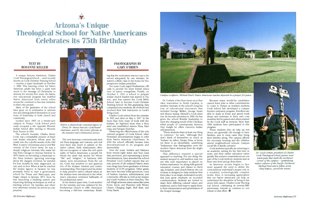 A unique Arizona institution, Charles Cook Theological School-until recently known as Cook Christian Training School - reaches a major landmark on October 1, 1986. This learning center for Native American adults has been a quiet testimony to the message of Christianity in Arizona for seventy-five years. Its distinctive educational program has enabled Native Americans from ninety tribes across the continent to become ministers to their own people. Many of the graduates of the school have gone on to seminaries or universities and distinguished themselves in positions of leadership in both church and community.