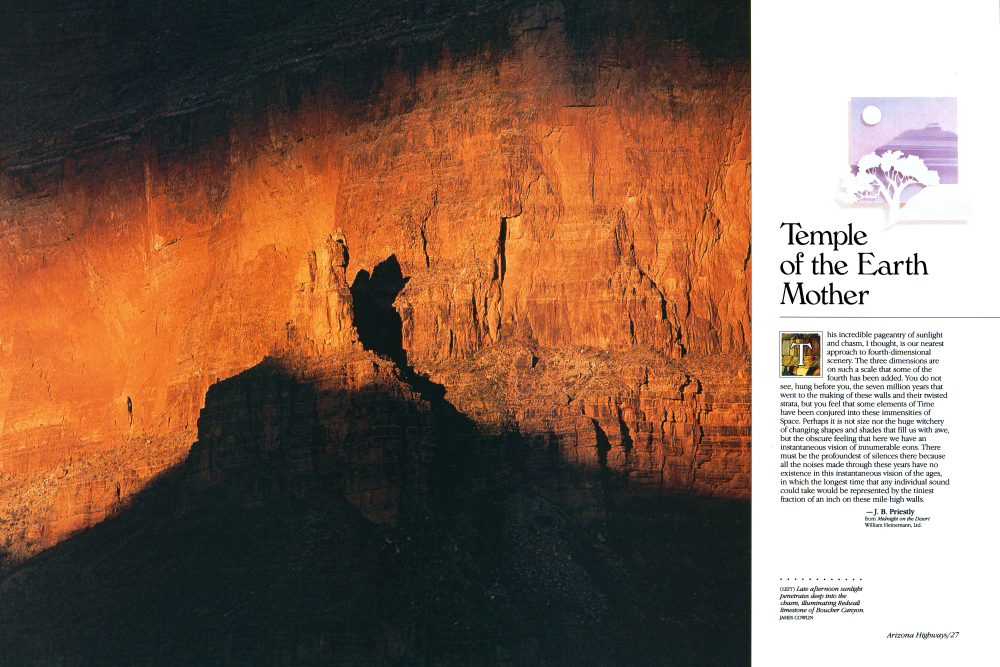 This incredible pageantry of sunlight and chasm, I thought, is our nearest approach to fourth-dimensional scenery. The three dimensions are on such a scale that some of the fourth has been added. You do not see, hung before you, the seven million years that went to the making of these walls and their twisted strata, but you feel that some elements of Time have been conjured into these immensities of Space. Perhaps it is not size nor the huge witchery of changing shapes and shades that fill us with awe, but the obscure feeling that here we have an instantaneous vision of innumerable eons. There must be the profoundest of silences there because all the noises made through these years have no existence in this instantaneous vision of the ages, in which the longest time that any individual sound could take would be represented by the tiniest fraction of an inch on these mile-high walls.