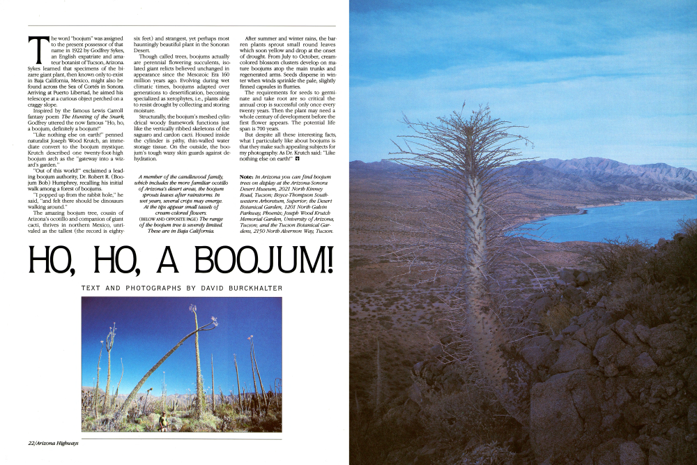 “I popped up from the rabbit hole,” he said, “and felt there should be dinosaurs walking around.” The amazing boojum tree, cousin of Arizona's ocotillo and companion of giant cacti, thrives in northern Mexico, unrivaled as the tallest (the record is eighty-six feet) and strangest, yet perhaps most hauntingly beautiful plant in the Sonoran Desert.