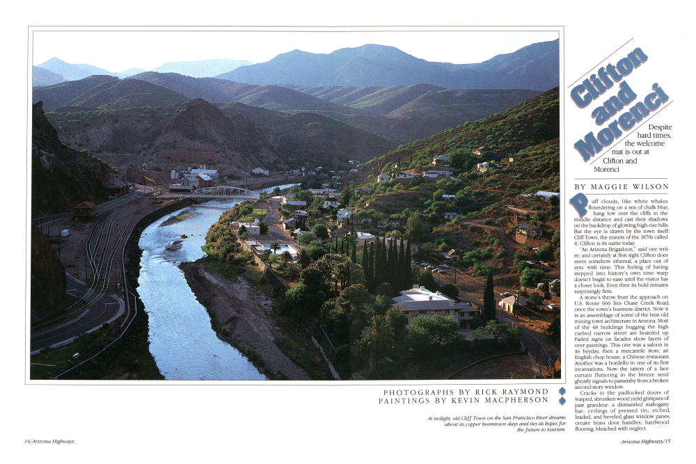 Despite hard times, the welcome mat is out at Clifton and Morenci Buff clouds, like white whales floundering on a sea of chalk blue, hang low over the cliffs in the middle distance and cast their shadows on the backdrop of glowing high-rise hills. But the eye is drawn by the town itself: Cliff Town, the miners of the 1870s called it; Clifton is its name today.