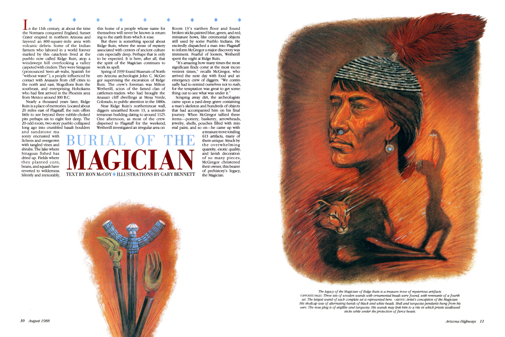 Nearly a thousand years later, Ridge Ruin is a place of memories. Located about 20 miles east of Flagstaff, the ruin offers little to see beyond three rubble-choked pits perhaps six to eight feet deep. The 20-odd-room, two-story pueblo collapsed long ago into crumbled basalt boulders and sandstone masonry encrusted with lichens and overgrown with tangled vines and shrubs. The lake where Sinaguas fished has dried up. Fields where they planted corn, beans, and squash have reverted to wilderness. Silently and inexorably, this home of a people whose name for themselves will never be known is returning to the earth from which it rose. But there is something special about Ridge Ruin, where the sense of mystery associated with centers of ancient culture cuts especially deep. Perhaps that is only to be expected. It is here, after all, that the spirit of the Magician continues to work its spell. Spring of 1939 found Museum of Northern Arizona archeologist John C. McGre gor supervising the excavation of Ridge Ruin. The crew's foreman was Milton Wetherill, scion of the famed clan of cattlemen-traders who had brought the Anasazi cliff dwellings at Mesa Verde, Colorado, to public attention in the 1880s. Near Ridge Ruin's northernmost wall, diggers unearthed Room 13, a semisub erranean building dating to around 1125. One afternoon, as most of the crew dispersed to Flagstaff for the weekend, Wetherill investigated an irregular area on Room 13's earthen floor and found broken sticks painted blue, green, and red; miniature bows, like ceremonial objects still used by some Pueblo Indians. He excitedly dispatched a man into Flagstaff to inform McGregor a major discovery was imminent. Fearful of looters, Wetherill spent the night at Ridge Ruin. "It's amazing how many times the most significant finds come at the most incon venient times," recalls McGregor, who arrived the next day with food and an emergency crew of diggers. "We contin ually had to remind ourselves not to rush, for the temptation was great to get some thing out to see what was under it." Scraping away dirt, the archeologists came upon a yard-deep grave containing a man's skeleton and hundreds of objects that had accompanied him on his final journey. When McGregor tallied these items-pottery, basketry, arrowheads, jewelry, shells, pouches filled with min eral paint, and so on he came up with a treasure trove totaling 613 artifacts, many of them unique. Struck by the overwhelming quantity, exotic quality, and lavish decoration of so many pieces, McGregor christened their owner, this bearer of prehistory's legacy, the Magician.