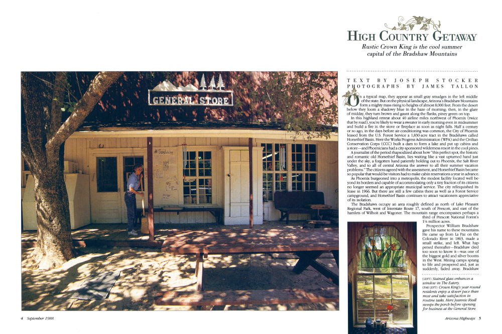 In this highland retreat about 40 airline miles northwest of Phoenix (twice that by road), you're likely to wear a sweater in early morning even in midsummer and build a fire in the stove or fireplace as soon as night falls. Half a century or so ago, in the days before air-conditioning was common, the City of Phoenix leased from the U.S. Forest Service a 1,830-acre tract in the Bradshaws called Horsethief Basin. Here the Works Progress Administration (WPA) and the Civilian Conservation Corps (CCC) built a dam to form a lake and put up cabins and a store-and Phoenicians had a city-sponsored wilderness resort in the cool pines.