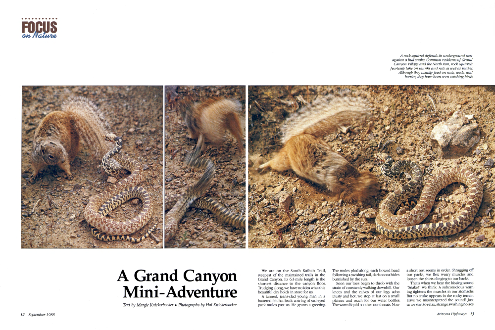 Text by Margie Knickerbocker Photographs by Hal Knickerbocker A rock squirrel defends its underground nest against a bull snake. Common residents of Grand Canyon Village and the North Rim, rock squirrels fearlessly take on skunks and rats as well as snakes. Although they usually feed on nuts, seeds, and berries, they have been seen catching birds.