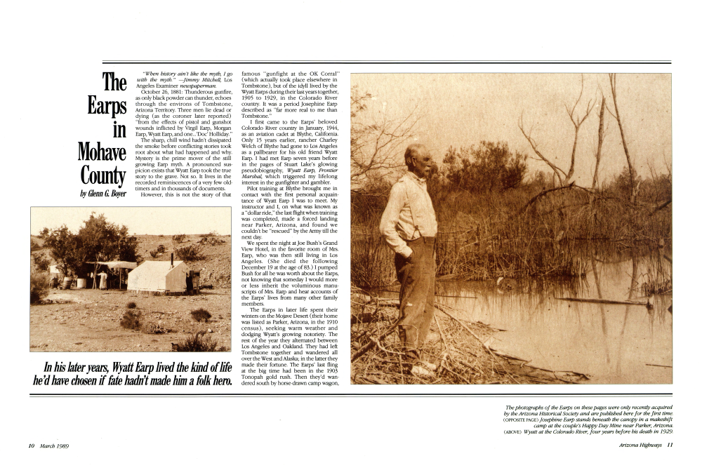 I first came to the Earps' beloved Colorado River country in January, 1944, as an aviation cadet at Blythe, California. Only 15 years earlier, rancher Charley Welch of Blythe had gone to Los Angeles as a pallbearer for his old friend Wyatt Earp. I had met Earp seven years before in the pages of Stuart Lake's glowing pseudobiography, Wyatt Earp, Frontier Marshal, which triggered my lifelong interest in the gunfighter and gambler.