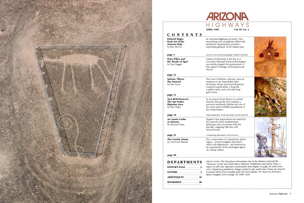 (FRONT COVER) The Huachuca Mountains rise in the distance beyond the "Narrows" of the San Pedro River, between Tombstone and Sierra Vista. A report on this new riparian conservation area begins on page 20. JERRY JACKA (LEFT) Mysterious prehistoric images etched in the earth near Yuma are fenced to protect them from vandals and off-road vehicles. For more on Arizona's desert intaglios, turn to page 38. HARRY CASEY