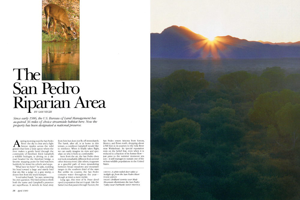Aspiring morning near the San Pedro River: the sky is clear and a light breeze ripples across the wild grasses that form a wide apron where the river makes a gentle bend through the community of Hereford. Erick Campbell, a wildlife biologist, is driving on a dirt road headed for the Hereford bridge, a favorite stopping point for bird-watchers. Suddenly he slows his vehicle and stops. "What have we here?" he asks, nodding his head toward a large and stately bird that sits like a judge on a gray stump, a dozen feet from the truck bumper. "A red-tailed hawk," he says, answering his own question. The bird seems to think both the name and Campbell's presence are superfluous. It swivels its head awayfrom him but does not fly off immediately. The hawk, after all, is at home in this terrain, a condition Campbell would like to reinforce. When it finally takes flight, we can easily imagine its view and speculate on why it feels so comfortable. Seen from the air, the San Pedro does not look remarkably different from several other Arizona rivers. Like others, it appears as a graceful path of trees meandering between broad meadows and mountain ranges in the southern third of the state. But unlike its cousins, the San Pedro contains water throughout the yearthough at times a mere trickle. Long ago, this river of St. Peter developed a reputation that set it apart. Like the Santa Cruz that passes through Tucson, theSan Pedro enters Arizona from Sonora, Mexico, and flows north, dropping about 2,500 feet in its journey to the Gila River near Winkelman. Its special reputation rests on the belief that, even when it is reduced to a fraction of its former flowjust prior to the summer monsoon season-it still manages to sustain one of the richest wildlife populations in the United States.