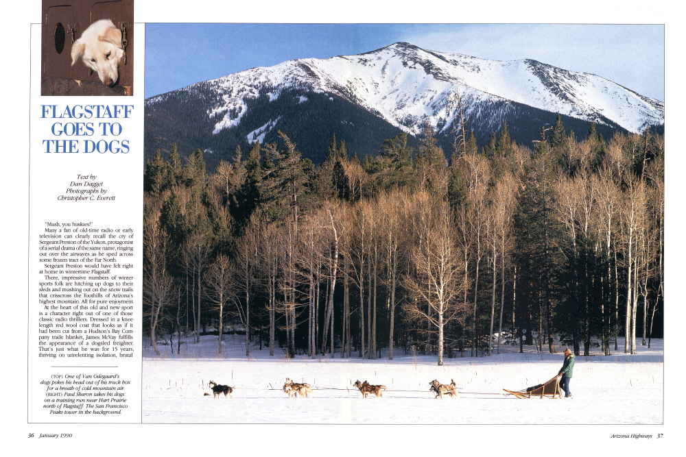 older woman. "Those dogs would have kept right on running for a mile or more." If anyone dispelled notions I may have had about these dogs being forced to do something against their will, it was Bonnie Brasseur. A veteran sled dog driver from Phoenix, she said the only command she ever had trouble getting her dogs to obey was "Whoa!" Have I given you the impression that dogsledding is new to Arizona? Actually it has been here since the mid-1970s. (See the February 1977 Arizona Highways.) But the sport was definitely on the wane until enthusiastic practitioners like McVay, Desert Dog Drivers President Matt Cusick, and his wife, Michelle, revived it. Today, lovers of this cold-weather sport are no longer restricted to Arizona's northern climes. Many live where snow is rare. To keep their dogs in shape, they hitch them to wheeled carts and mush around the cactus-studded Sonoran Desert. Not surprisingly, these desert dog teams turn a lot of heads as they go yapping and panting by. "We run our dogs just north of Scottsdale in the winter when the weather is cool, and take them to Flagstaff on weekends so they don't forget what snow is like," Matt Cusick said. Thanks to the sport's zealous fraternity, more Arizonans are becoming dog drivers every year, and new race events are appearing. Mushers can now add to their schedules an event in the White Mountain community of Alpine. And others are being discussed. There's even the possibility that one day races will be held in the desert, with carts instead of sleds. Sergeant Preston would have loved it. Author's note: The Alpine Sled Dog Races will occur January 6 and 7. The Flagstaff Winter Festival Race is scheduled for February 17 and 18. For race information, contact Matt Cusick, Desert Dog Drivers of Arizona, 10402 N. 38th St., Phoenix, AZ 85028, telephone (602) 494-0826; Robert Pleger, Mountain Mushers, 410 Homestead Ln., Flagstaff, AZ 86004, (602) 526-9536; or James McVay, Mountain Mushers, 148 Valley View Dr., Flagstaff, AZ 86004, (602) 527-0236.