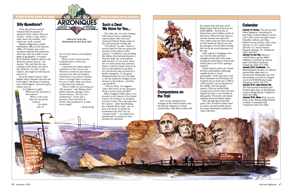 Every day Arizona tourism bureaus field thousands of questions from visitors. Most are routine-where to stay, what to wear, how's the weather-but others are...well, unusual. Marjorie Magnusson, public information officer at the Arizona Office of Tourism, says some questions indicate that Americans aren't the only ones with a loose grasp of geography. "A woman from Northern Ireland called to ask about the Grand Canyon," she reports. "She said that she was coming to New Jersey, and since she would be 'so close' to the Canyon, she might as well drop by and see it."