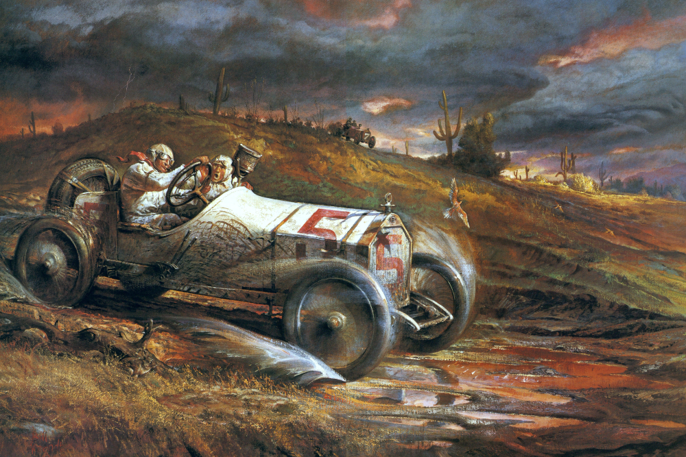 Arizonans' infatuation with the automobile was assured a new vigor in the fall of 1914 when the Cactus Derby, a grueling, hazardous road race then in its sixth year, got off to a roaring start in Los Angeles. The race to Phoenix across desert trails and through rugged mountains was run partly to promote better roads. Conducted each year from 1908 through 1917, the Derby was without doubt the roughest race ever held annually in the United States. And in this year of 1914, some of the world's greatest drivers were competing. Among the 20 starters were Louis Chevrolet, Olin Davis, Louis Nikrent, and that barnstorming favorite, Barney Oldfield. The prize? A diamond-studded medal, embossed "Master Driver of the World."