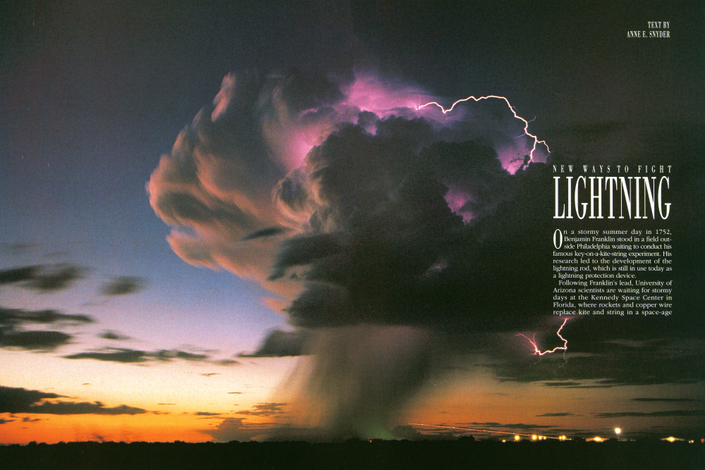 In a stormy summer day in 1752, Benjamin Franklin stood in a field outside Philadelphia waiting to conduct his famous key-on-a-kite-string experiment. His research led to the development of the lightning rod, which is still in use today as a lightning protection device. Following Franklin's lead, University of Arizona scientists are waiting for stormy days at the Kennedy Space Center in Florida, where rockets and copper wire replace kite and string in a space-ageversion of Franklin's experiment - rocket triggered lightning. This is the eighth year that an international collaboration of scientists, including those from the UofA, will gather information in the NASA-sponsored program.