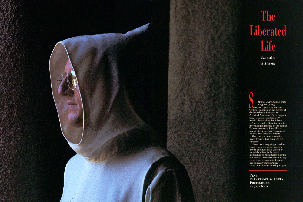 Most of us are citizens of the Kingdom of Stuff. One opens a poem by Andrew Costello, displayed in the narthex of the Benedictine Sanctuary of Perpetual Adoration. It's an eloquent line, a sermon complete in 10 words. The scolding that follows isn't even needed. Standing here in the enveloping silence of this central Tucson monastery, I feel like a tourist with a passport from an evil empire. The Kingdom of Stuff. The poet has done something more, though, than make me feel chastised.I have been struggling to understand why a few dozen modern monks and nuns have chosen to spend their lives in the small archipelago of monasteries in southern Arizona. The discipline is so rigorous that to an outsider it seems like voluntary imprisonment - rising at 3:15 every morning to pray.