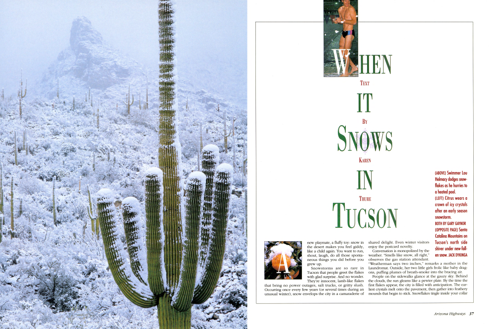A new playmate, a fluffy toy: snow in the desert makes you feel giddy, like a child again. You want to run, shout, laugh, do all those spontaneous things you did before you grew up. Snowstorms are so rare in Tucson that people greet the flakes with glad surprise. And no wonder. They're innocent, lamb-like flakes that bring no power outages, salt trucks, or gritty slush. Occurring once every few years (or several times during an unusual winter), snow envelops the city in a camaraderie of shared delight. Even winter visitors enjoy the postcard novelty. Conversation is monopolized by the weather. "Smells like snow, all right," observes the gas station attendant. "Weatherman says two inches," remarks a mother in the Laundromat. Outside, her two little girls frolic like baby dragons, puffing plumes of breath-smoke into the bracing air. People on the sidewalks glance at the gauzy sky. Behind the clouds, the sun gleams like a pewter plate. By the time the first flakes appear, the city is filled with anticipation. The ear-liest crystals melt onto the pavement, then gather into feathery mounds that begin to stick. Snowflakes tingle inside your collar