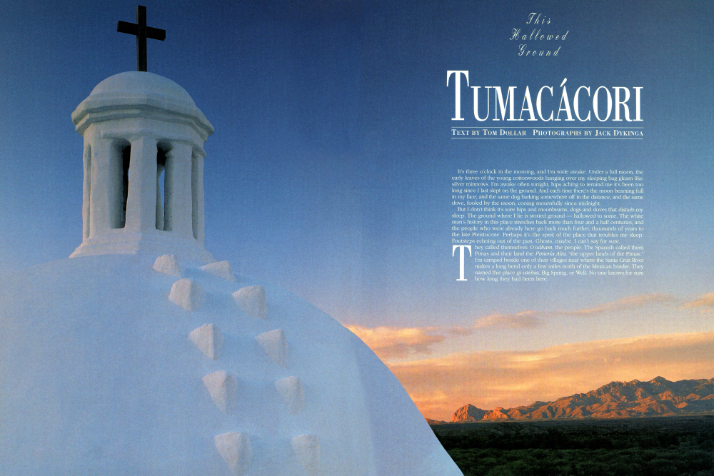 TEXT BY TOM DOLLAR PHOTOGRAPHS BY JACK DYKINGA It's three o'clock in the morning, and I'm wide awake. Under a full moon, the early leaves of the young cottonwoods hanging over my sleeping bag gleam like silver minnows. I'm awake often tonight, hips aching to remind me it's been too long since I last slept on the ground. And each time there's the moon beaming full in my face, and the same dog barking somewhere off in the distance, and the same dove, fooled by the moon, cooing mournfully since midnight. But I don't think it's sore hips and moonbeams, dogs and doves that disturb my sleep. The ground where I lie is storied ground - hallowed to some. The white man's history in this place stretches back more than four and a half centuries, and the people who were already here go back much further, thousands of years to the late Pleistocene. Perhaps it's the spirit of the place that troubles my sleep. Footsteps echoing out of the past. Ghosts, maybe. I can't say for sure.