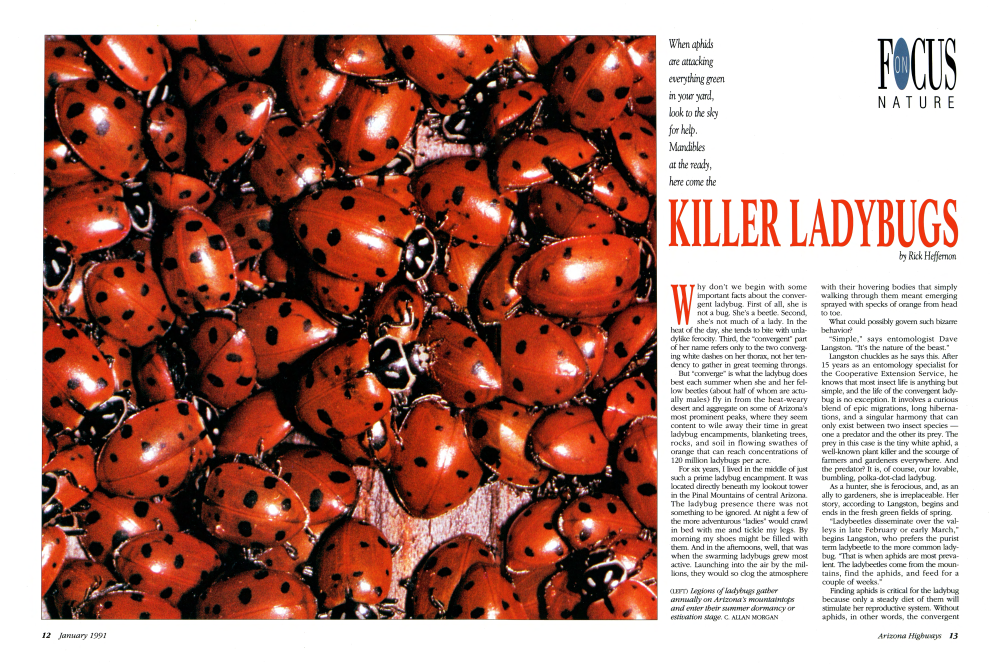 Why don't we begin with some important facts about the convergent ladybug. First of all, she is not a bug. She's a beetle. Second, she's not much of a lady. In the heat of the day, she tends to bite with unladylike ferocity. Third, the "convergent" part of her name refers only to the two converging white dashes on her thorax, not her tendency to gather in great teeming throngs. But "converge" is what the ladybug does best each summer when she and her fellow beetles (about half of whom are actually males) fly in from the heat-weary desert and aggregate on some of Arizona's most prominent peaks, where they seem content to wile away their time in great ladybug encampments, blanketing trees, rocks, and soil in flowing swathes of orange that can reach concentrations of 120 million ladybugs per acre. For six years, I lived in the middle of just such a prime ladybug encampment. It was located directly beneath my lookout tower in the Pinal Mountains of central Arizona. The ladybug presence there was not something to be ignored. At night a few of the more adventurous "ladies" would crawl in bed with me and tickle my legs. By morning my shoes might be filled with them. And in the afternoons, well, that was when the swarming ladybugs grew most active. Launching into the air by the millions, they would so clog the atmosphere with their hovering bodies that simply walking through them meant emerging sprayed with specks of orange from head to toe. What could possibly govern such bizarre behavior? "Simple," says entomologist Dave Langston. "It's the nature of the beast." Langston chuckles as he says this. After 15 years as an entomology specialist for the Cooperative Extension Service, he knows that most insect life is anything but simple, and the life of the convergent ladybug is no exception. It involves a curious blend of epic migrations, long hibernations, and a singular harmony that can only exist between two insect species one a predator and the other its prey. The prey in this case is the tiny white aphid, a well-known plant killer and the scourge of farmers and gardeners everywhere. And the predator? It is, of course, our lovable, bumbling, polka-dot-clad ladybug. As a hunter, she is ferocious, and, as an ally to gardeners, she is irreplaceable. Her story, according to Langston, begins and ends in the fresh green fields of spring. "Ladybeetles disseminate over the valleys in late February or early March," begins Langston, who prefers the purist term ladybeetle to the more common ladybug. "That is when aphids are most prevalent. The ladybeetles come from the mountains, find the aphids, and feed for a couple of weeks." Finding aphids is critical for the ladybug because only a steady diet of them will stimulate her reproductive system. Without aphids, in other words, the convergent