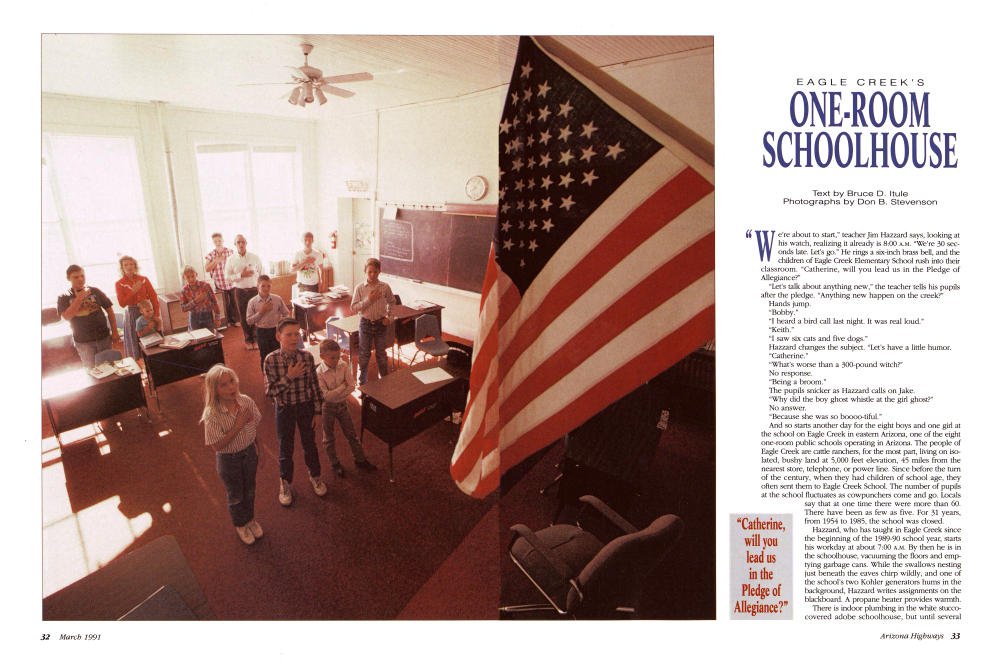 Text by Bruce D. Itule Photographs by Don B. Stevenson “We're about to start,” teacher Jim Hazzard says, looking at his watch, realizing it already is 8:00 A.M. “We're 30 seconds late. Let's go.” He rings a six-inch brass bell, and the children of Eagle Creek Elementary School rush into their classroom. “Catherine, will you lead us in the Pledge of Allegiance?” “Let's talk about anything new,” the teacher tells his pupils after the pledge. “Anything new happen on the creek?” Hands jump. “Bobby.” “I heard a bird call last night. It was real loud.” “Keith.” “I saw six cats and five dogs.” Hazzard changes the subject. “Let's have a little humor. “Catherine.” “What's worse than a 300-pound witch?” No response. “Being a broom.” The pupils snicker as Hazzard calls on Jake. “Why did the boy ghost whistle at the girl ghost?” No answer. “Because she was so boooo-tiful.” And so starts another day for the eight boys and one girl at the school on Eagle Creek in eastern Arizona, one of the eight one-room public schools operating in Arizona. The people of Eagle Creek are cattle ranchers, for the most part, living on isolated, bushy land at 5,000 feet elevation, 45 miles from the nearest store, telephone, or power line. Since before the turn of the century, when they had children of school age, they often sent them to Eagle Creek School. The number of pupils at the school fluctuates as cowpunchers come and go. Locals say that at one time there were more than 60. There have been as few as five. For 31 years, from 1954 to 1985, the school was closed.