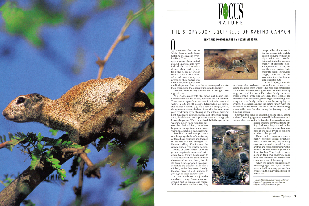 One summer afternoon in Sabino Canyon, in the Santa Catalina Mountains overlooking Tucson, I came upon a group of roundtailed ground squirrels, little furry individuals that looked as though they had sprung from the pages of one of Beatrix Potter's storybooks. After acknowledging my presence, they bolted into their holes, leaving exposed the hind quarters of two juveniles who attempted to make their escape into the underground simultaneously. I decided to return very early the next morning to photograph them. At 6:17 A.M., armed with film, tripod, and 400mm lens, I marched toward the colony, tiptoeing the last few feet. There was no sign of the creatures. I decided to wait and watch. By 7:25 and still no sign, it dawned on me: they're still asleep! Not until 8:30 did I spy two sleepy, shiny, ebony eyes surveying the land. Soon all holes were occupied by drowsy eyes blinking in the intense morning light. One brave juvenile crawled out. Stretching luxuriantly, he delivered an impressive yawn exposing yellowed sharp teeth. When he reclined, belly flat against the warming desert floor, hind legs outstretched behind him, the others began to emerge from their holes, yawning, scratching, and stretching. Stealthily I moved my tripod without disrupting the blissful wakening of these furry creatures and focused on the one who had emerged first. He was nodding off as I pressed the release button. The shutter clacked. The motor drive roared. And the ground squirrels convulsed with alarm, fleeing toward their burrows to escape whatever it was that had stolen their tranquil morning. Soon, though, 20 furry heads popped up again, repeating the scenario. Each time I clicked, under they went. Finally, their fear dissolved, and I was able to photograph them continuously. At two months old, the juveniles are able to emerge from their underground nest to explore and forage. With instinctive deliberation, they creep, bellies almost touching the ground, tails slightly curved, swaying from left to right with each stride. Although their diet consists mainly of creosote blossoms, desert tea, cactus, cactus flowers, cactus fruit, mesquite beans, leaves, and twigs, I watched as one youngster feverishly ingested a cigarette butt. While foraging, the mother, always alert to danger, repeatedly inches up to her young and gives them a "kiss." This naso-oral contact aids the squirrel in distinguishing between kindred, friendly neighbors, and intruders. Each time family members make contact with one another, their scents are exchanged and transferred, producing an identifying odor unique to that family. Initiated most frequently by the infants, it is shared among the entire family with the exception of the father. The male, exiled after mating, mates with other females during the January to April breeding season. Sparring drills serve to establish pecking order. Young males of breeding age must reestablish themselves each season when competing for females. I observed one adolescent creeping toward a dozing sibling. Suddenly, he pounced on his unsuspecting kinsman, and they tumbled in the sand trying to pin one another to the ground. These comic characters possess a highly complex social structure. Notably affectionate, they initially express a genuine need for one another and for social bonding within the litter. As independence grows, the litter dissolves. They begin to sleep alone in their own burrows, claim their own territories, and interact with other members of the colony. When the ground squirrels reach breeding age, the cycle of life repeats itself, opening yet another chapter in the marvelous book of Nature.