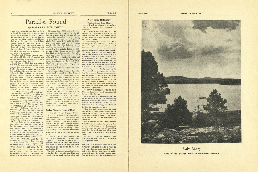 Lake Mary: As unpretentious and lovely as its name, Lake Mary is waiting for the office or domestic worn soul to partake of her bounty. Fishing, boating and swimming. let alone simply basking in the bouyant mountain air, will give anyone a new lease on life. A huge bass, the grandfather of them all, is in the Lake Mary Spillway, challenging the cleverest angler to entice him out of his hiding place under the rocks. So far this season he has eluded them all. This particular spot is ideal for the vacationist who wishes to be close to a larger community. Nine miles from Flagstaff.
