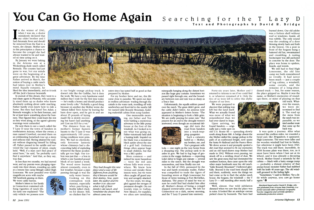 He sent them to see a ranch called the T Lazy D near the town of Sanders in northeastern Arizona, where the owner, a man named Crawford, escorted them on an exhilarating horseback tour up a steep and arduous trail. Having attained the summit without disgracing himself by falling off, Father paused in the saddle and surveyed the vast expanse of silent, empty land. "Well, if a man can't find peace of mind here," he said, "he probably can't find it anywhere." And that, as they say, was that.